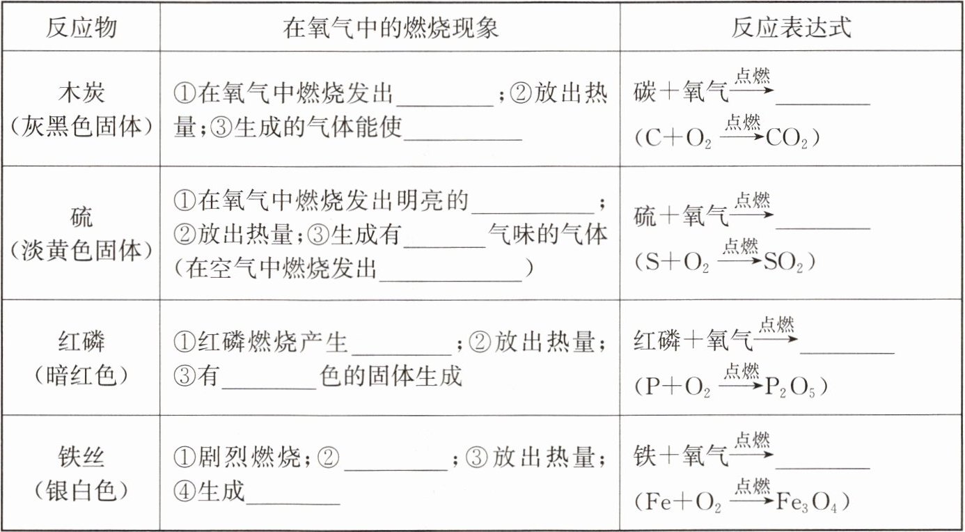 | 反应物 | 在氧气中的燃烧现象 | 反应表达式 |