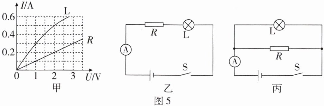 6. 图5 - 甲为灯泡$L$和定值电阻的电阻$R$的$I - U$图像,已知灯泡$L$的额定电压为$2V$,将它们先后接入图5 - 乙、丙所示电路中,灯泡$L$均正常发光。下列说法不正确的是(