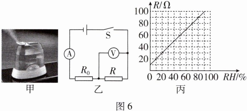 7. 图6 - 甲是某超声波加湿器,其内部湿度监测装置的简化电路图如图6 - 乙所示,根据电压表的示数可以判断湿度的高低。已知电源电压恒为$12V$,定值电阻的电阻$R_{0}$为$30Ω$,湿敏电阻的电阻$R$随湿度$RH$变化的关系图像如图6 - 丙所示。求: