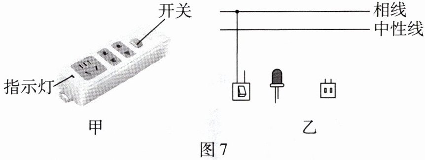 7. 图 7 - 甲是一个带开关和指示灯的插线板,按下开关后,指示灯会发光,插孔能够提供工作电压;若指示灯损坏,插孔仍能正常工作。请根据上述说明,在图 7 - 乙中画出开关、指示灯和插孔的连接方式,并与电源线接通。