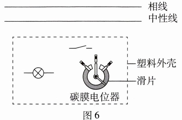 6. 如图 6 所示,小周用碳膜电位器设计了一个可调亮度的电灯,为了安全,她把电路元器件安装在塑料外壳内。请根据安全用电原则,把各元器件连入家庭电路中,要求:滑片顺时针转动时电灯变亮。