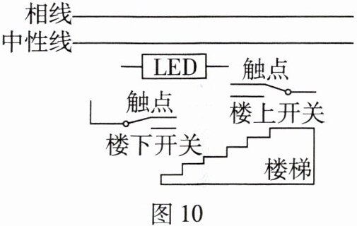 10. 小明想用两个单刀双掷开关、一个 LED 和若干导线,设计一个楼梯灯电路,无论是楼上还是楼下都可以任意开灯、关灯,既可以在楼下开灯到楼上关灯,又可以在楼上开灯到楼下关灯。请你根据小明的设计意图,用笔画线表示导线完成图 10 中的电路。