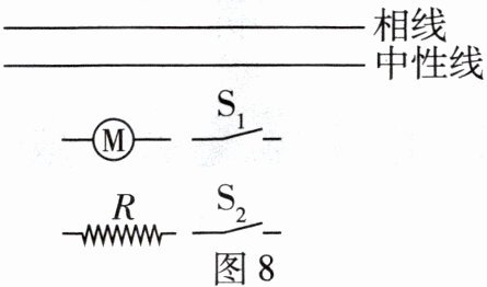 8. 图 8 为吹风机工作时的电路示意图,其中ⓜ是电动机,R 是电热丝,S₁、S₂ 是开关。请按照安全用电原则将电路补充完整。要求:①吹风机既能吹冷风也能吹热风;②电热丝 R 不能独立工作,即当电热丝 R 发热时,一定有风吹出。
