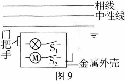 9. 图 9 为冰箱工作时的部分电路示意图。冰箱内照明灯由开关 S₁ 控制,压缩机 M 由开关 S₂ 控制。根据题意,将图连接完整,并符合安全用电原则。