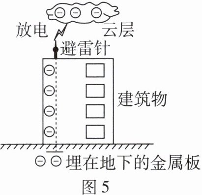 10. (2024广州)如图5所示,带负电的云层靠近建筑物上的避雷针时,向避雷针释放负电荷形成雷电,下列说法正确的是(