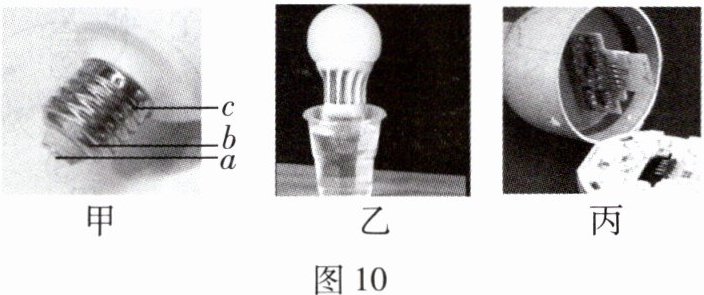 (选填“a”或“b”)和c两部分,发现灯泡也能发光。(4) 小明拆开灯泡塑料壳,如图10 - 丙所示,证明了猜想正确。除小明的实践结论外,还支持小明猜想的物理学原理或规律是