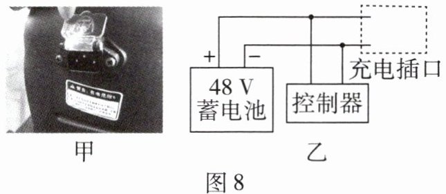 10. 物理与生活 图8 - 甲所示为某电动车的充电插口,图8 - 乙是其局部电路图。在使用过程中不能拿硬币触碰充电插口的两个金属插脚,否则会造成蓄电池