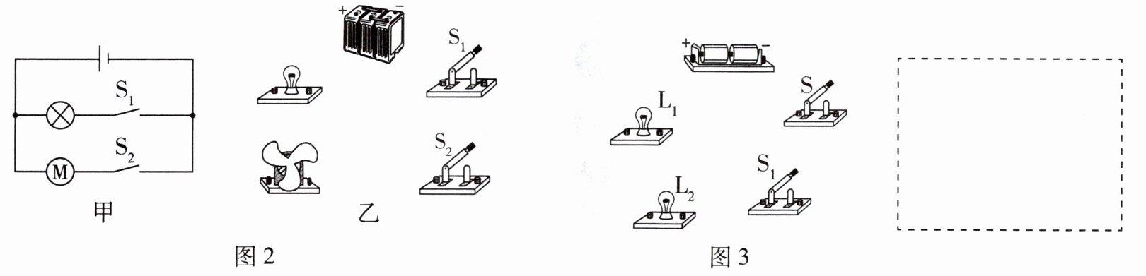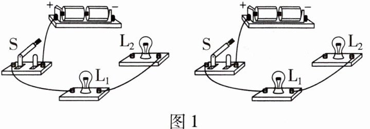 3. 请用笔画线表示导线,用两种不同的方式把图1中的两个实物电路连接完整,导线不能交叉。要求:开关同时控制两个灯泡,闭合开关后,两灯均能发光。