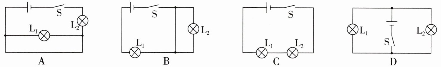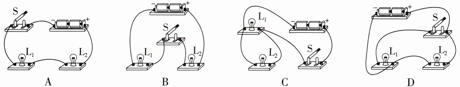 2. 某同学连接了四个电路来探究开关的控制作用,其中开关S只控制灯泡L₁的电路是(