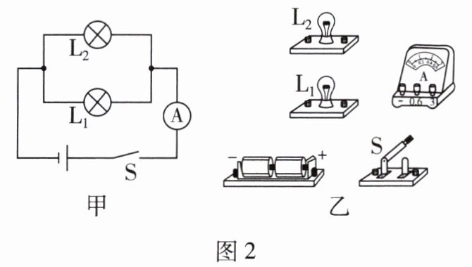 (1) 请用笔画线表示导线,按照图2 - 甲所示的电路图,连接图2 - 乙中的实物电路。(已知干路电流不超过0.6 A)