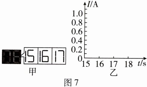 10. 图7 - 甲是一款两位数的计时器,每个数字由相同规格的长灯条并联组成。计时器工作时,通过每个长灯条的电流都是0.1 A。请在图7 - 乙中画出:从数字15到数字17的过程中,计时器干路中的电流随时间变化的关系图像。(每个数字的亮灯时间按1 s计)
