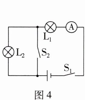 5. 图4所示的电路中,当开关$S_{1}$闭合、$S_{2}$断开时,电流表的示数为0.24 A,此时通过灯泡$L_{1}$的电流为A,通过灯泡$L_{2}$的电流为A;当开关$S_{1}$和$S_{2}$均闭合时,电流表的示数为0.56 A,此时通过灯泡$L_{1}$的电流为A,通过灯泡$L_{2}$的电流为A。