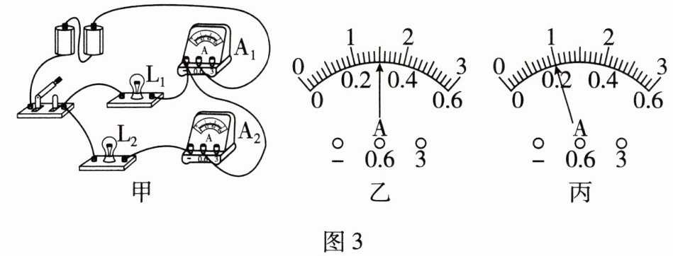 4. 图3 - 甲所示的电路中,开关闭合后,灯泡$L_{1}$、$L_{2}$联;若电流表$A_{1}$、$A_{2}$的示数分别如图3 - 乙、丙所示,则通过灯泡$L_{1}$的电流为A,通过灯泡$L_{2}$的电流为A。