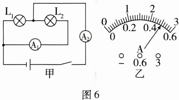 8. 图6 - 甲所示的电路中,闭合开关,两灯泡均发光,电流表$A_{1}$、$A_{2}$指针的位置均如图6 - 乙所示。通过灯泡$L_{1}$、$L_{2}$的电流之比为(