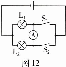 (写出 $ I_A $、$ I_B $ 和 $ I_C $ 的关系式)。(4) 同组的小林做该实验时设计的电路如图 12 所示,他的方案是先只闭合开关 $ S_2 $,测出通过灯$ L_1 $ 的电流 $ I_1 $;然后只闭合开关 $ S_1 $,测出通过灯 $ L_2 $ 的电流 $ I_2 $,比较 $ I_1 $ 和 $ I_2 $ 的大小。你认为小林的方案