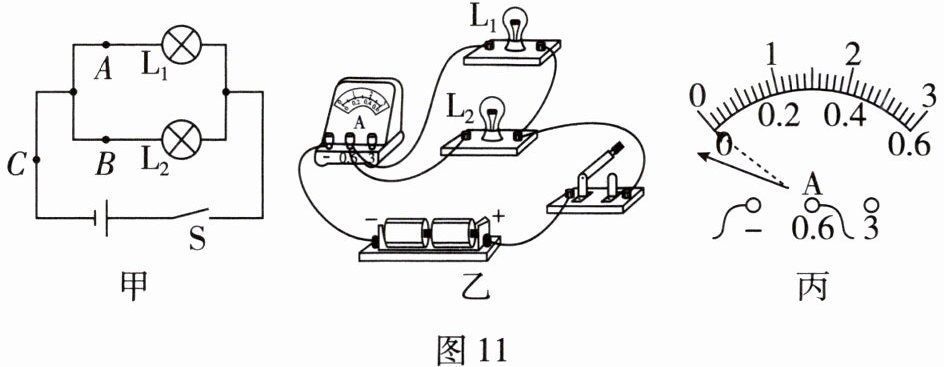 12. 为了探究“并联电路中干路电流与各支路电流的关系”,小明设计了图 11 - 甲所示的电路进行实验。