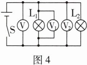 4. 如图4所示的电路,灯 $L_1$ 的电阻比灯 $L_2$ 的大,闭合开关 $S$ 后,两灯均发光,电压表 $V_2$ 的示数为2.5 V,下列说法正确的是()