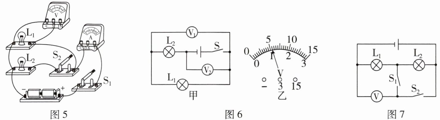 9. 图7所示的电路中,电源电压为6 V,只闭合开关 $S_1$,电压表的示数为4 V,此时灯 $L_1$、$L_2$ 两端的电压之比为