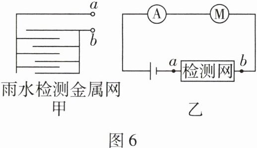 10. 有些汽车的前挡风玻璃上的刮水器能随雨量大小改变刮水速度,并在雨停后自动停止工作。小华查阅资料后,自制了如图6 - 甲所示的雨水检测金属网(以下简称检测网),并设计了如图6 - 乙所示的模拟电路进行探究。