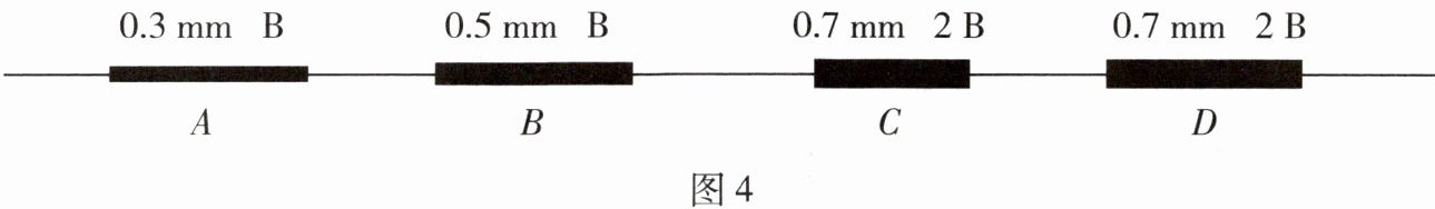 8. 小红发现有的铅笔上标有“$2B$”,有的标有“$4B$”。她查阅资料了解到:“$B$”前的数字越大,表示铅笔芯中石墨的含量越高,铅笔芯的导电性能越好。如图4所示,小红将四根铅笔芯串联在电路中,每根铅笔芯的直径和型号已标注,且铅笔芯$A$、$B$、$D$的长度相同。则四根铅笔芯中,电阻最大的是铅笔芯