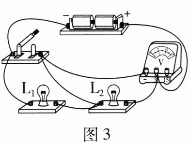10. 在“探究并联电路中电压的规律”实验中,小君连接的部分实物电路如图3所示,其中有一根导线连接错误,请在接错的导线上打“×”,并画出正确的接法。