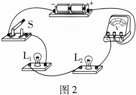 9. 小乐做“探究并联电路中电压的规律”实验时连接的部分实物电路如图2所示,请用笔画线表示导线在图中增加两条导线,使电路连接正确。要求:开关闭合后,电压表测量灯L₂两端的电压。