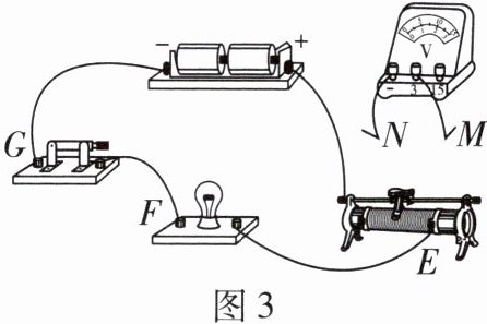 3. 在用滑动变阻器改变小灯泡亮度的实验中,无论怎样移动滑片,灯泡都不亮。如图3所示,小明找来一个电压表,将M接电源“+”极,N依次试触E、F、G接线柱,发现电压表的示数前两次为零,第三次接近3V。若故障只有一处,则可能是 (