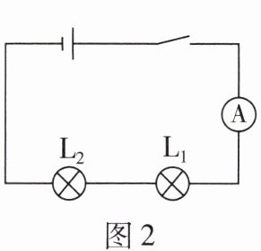 2. 如图2所示,小明在做“探究串联电路中电流的特点”实验时,闭合开关后,两灯均不亮,电流表无示数。于是他将一根导线并联在灯L₁两端,两灯仍不亮;将导线并联在灯L₂两端,灯L₁亮了。电路中出现的故障可能是 (