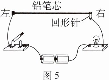 2. (2024徐州改编)如图5所示,小明用铅笔芯做滑动变阻器,设计并制作一个模拟调光灯,器材有电池组(电压为3 V)、小灯泡(2.5 V 0.3 A)、铅笔芯、金属回形针、开关、导线、电压表。