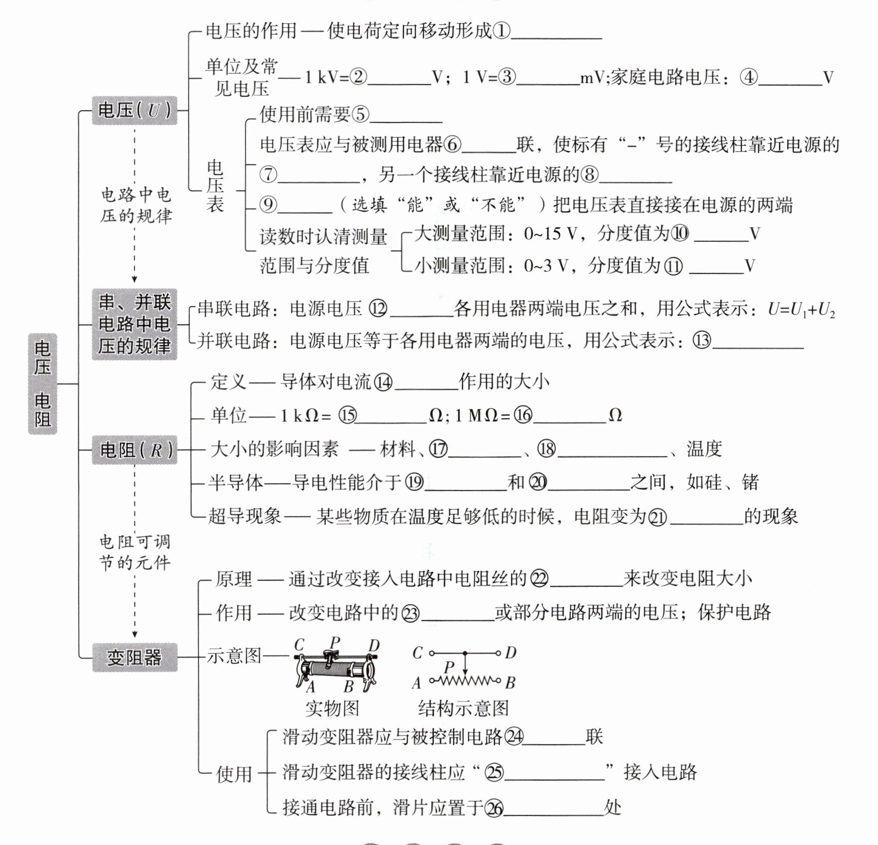 ①电流 ②1000 ③1000 ④220 ⑤调零 ⑥并 ⑦负极 ⑧正极 ⑨能 ⑩0.5 ⑪0.1 ⑫等于 ⑬U = U₁ = U₂ ⑭阻碍 ⑮1000 ⑯10⁶ ⑰长度 ⑱横截面积 ⑲导体 ⑳绝缘体 ㉑零 ㉒长度 ㉓电流 ㉔串 ㉕一上一下 ㉖最大电阻