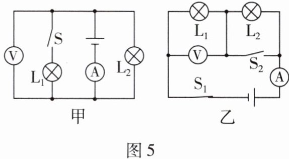 ;在图 5 - 乙所示的电路中,电源电压不变,开关 $S_1$ 始终闭合,当开关 $S_2$ 由断开到闭合时,电压表的示数变大
