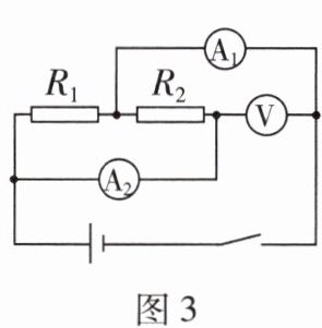 4. 如图 3 所示的电路,闭合开关后,电压表的示数为 $6V$,电流表 $A_1$ 的示数为 $0.5A$,电流表 $A_2$ 的示数为 $0.3A$,则电阻为 $R_2$ 的定值电阻两端的电压为