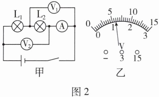 3. 如图 2 - 甲所示,闭合开关后,电流表的示数为 $0.5A$,电压表 $V_1$、$V_2$ 的指针偏转情况均如图 2 - 乙所示,该电路中灯泡 $L_1$、$L_2$