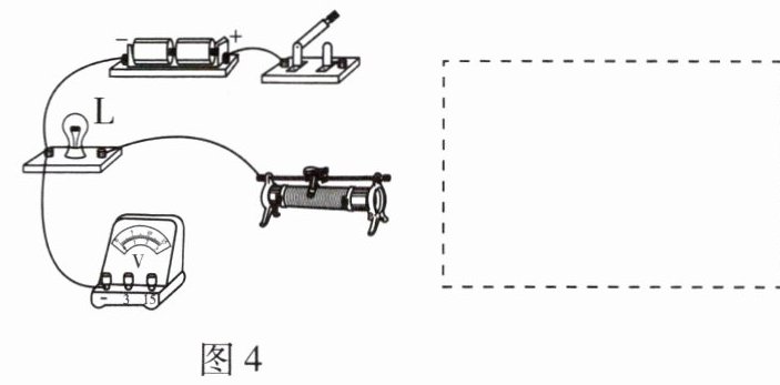 5. 请用笔画线表示导线将图 4 中的实物电路连接完整,并在虚线框中画出对应的电路图。要求:闭合开关后,向右移动滑动变阻器的滑片时小灯泡变亮,电压表测小灯泡两端的电压。