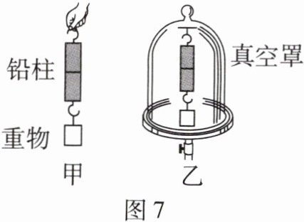 15. 科学探究小金用力将底面已锉平的两个铅柱紧压在一起,然后将它们悬挂起来,并在下方挂一个质量为10 kg的重物,发现两铅柱不分开(如图7-甲)。那么该现象是大气压力造成的还是铅柱接触面处分子间的引力造成的?小金将图7-甲中的铅柱与重物固定在一个真空罩内(如图7-乙),并逐渐抽出罩内的空气。(当地大气压为 $1.0×10^{5}Pa$,g取10 N/kg)