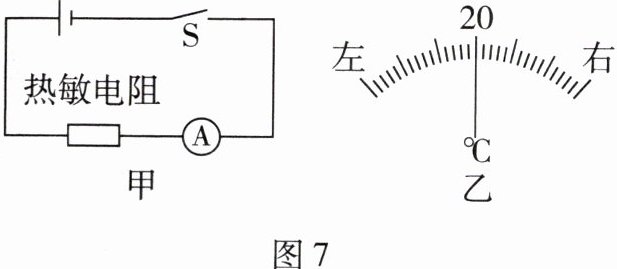 (2) 将电流表中的电流刻度换成相应的温度刻度,就能直接显示出热敏电阻附近的温度(如图7 - 乙),表盘中 $ 25℃ $ 的刻度应在 $ 20℃ $ 刻度的