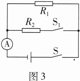 7. 如图3所示的电路中,电源电压保持不变,定值电阻的电阻分别为 $ R_1 $、$ R_2 $,$ R_2 = 15Ω $,闭合开关S,电流表的示数为0.3A,再闭合开关 $ S_1 $,电流表的示数变化了0.4A,则电源电压为