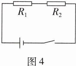 8. 如图4所示的电路中,电源电压为9V且保持不变,两定值电阻的电阻分别为 $ R_1 $、$ R_2 $,$ R_1 = 10Ω $。闭合开关后,电阻为 $ R_1 $ 的定值电阻两端的电压为3V,求: