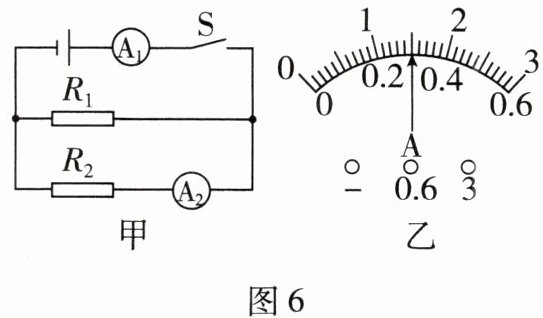 11. 如图6 - 甲所示,定值电阻的电阻分别为 $ R_1 $、$ R_2 $,$ R_2 = 40Ω $。闭合开关S后,电流表 $ A_1 $、$ A_2 $ 的指针偏转情况均如图6 - 乙所示,则电流表 $ A_1 $ 的示数为
