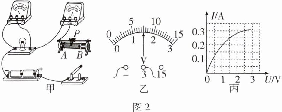 $ V $。(4) 根据实验数据绘制的小灯泡的$ I - U $图像如图2 - 丙所示,小灯泡正常发光时的电阻为