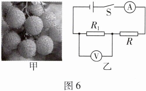 6. 深圳特色 如图 6 - 甲,南山荔枝果大肉厚、汁多核小、甘甜清香,是深圳“南山三宝”之一。果农用石墨烯制成“甜敏”电阻检测南山荔枝含糖量,图 6 - 乙是检测南山荔枝含糖量的简化电路图,电源电压不变,定值电阻的电阻为 $ R_1 $,“甜敏”电阻的电阻 R 随含糖量的升高而增大。将“甜敏”电阻附着在剥开的南山荔枝上,当南山荔枝含糖量升高时(