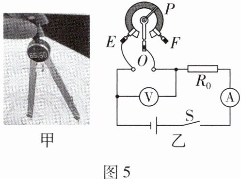 5. (2024 宝安区模拟)图 5 - 甲所示是一款智能化数显式圆规,它可以直接显示出所画圆的半径大小 r,其内部等效电路图如图 5 - 乙所示。OEF 为可旋转调节接入电阻的变阻器,闭合开关 S,当 r 增大时滑片 P 向顺时针方向转动,反之,则向逆时针方向转动。下列说法正确的是(