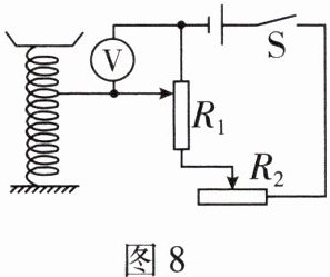 9. (2024 陕西)小明在课外实践活动中设计了一款台秤,其显示端由电压表表盘改装而成,电路设计如图 8 所示,两个滑动变阻器的电阻分别为 $ R_1 $、$ R_2 $。闭合开关 S,下列关于该台秤的分析正确的是(