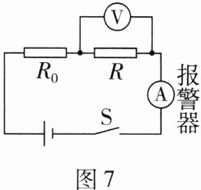 7. 社会责任 电梯超载容易引发安全隐患,某电梯的超载报警电路图如图 7 所示。已知电源电压恒定不变,保护电阻的电阻恒为 $ R_0 $,力敏电阻的电阻 R 随电梯内压力的增大而减小,电流表的示数超过临界值 $ I_0 $ 就会自动报警。电梯正常工作时,下列说法正确的是(