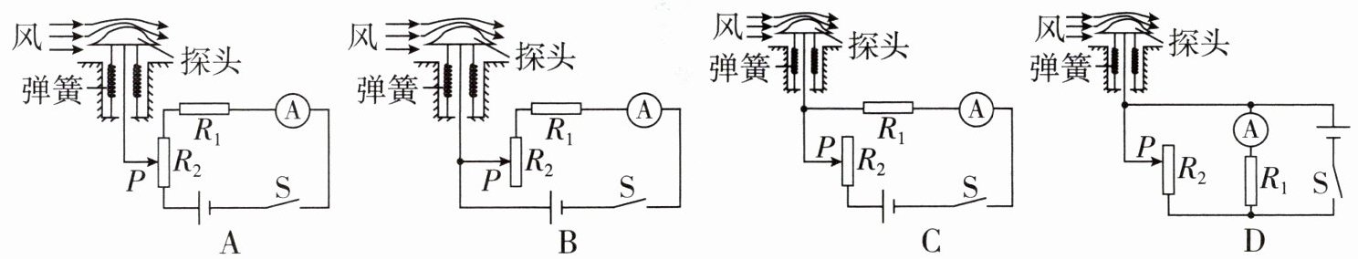 8. 某实践活动小组想要制作一个风速探测器。闭合开关,当水平方向的风吹过时,探头产生升力,弹簧的长度会发生变化,与探头连接的金属板带动滑片 P 移动,风速越高,电流表的示数越大。下列模拟电路中,符合要求的是(