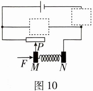11. 物理与生活 图 10 为一握力计的简化电路图,电阻为 $ R_0 $ 的定值电阻及电表未画出,金属板 N 固定不动,金属板 M 可带动金属滑片 P 滑动,若弹簧的电阻不计,电源电压保持不变,要求握力增大时,电表的示数也增大,请在虚线框中填入定值电阻和电表的符号。
