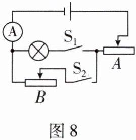 9. (2025深圳模拟)小芳设计了图8所示的电路,用来测量小灯泡正常工作时的电阻。实验方案如下:(电源电压不变,滑动变阻器$A$的最大阻值为$R_{m}$,滑动变阻器$B$的最大阻值未知,小灯泡正常工作时的电流为$I_{L}$)