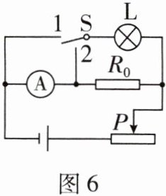 6. 小南设计了图6所示的电路来测量小灯泡L正常工作时的电阻。已知电源电压恒定,定值电阻的电阻为$R_{0}$,小灯泡L正常工作时的电压为$U_{0}$,实验步骤如下: