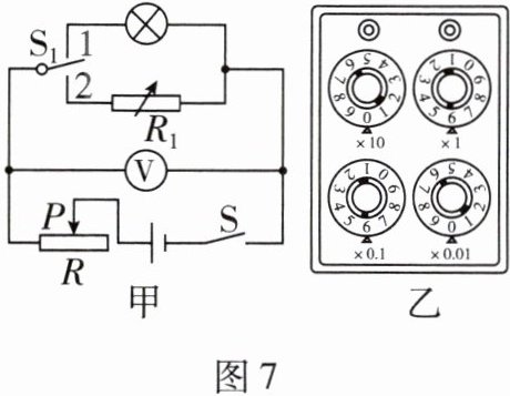 (2) 选择正确的实验操作后,电阻箱上各旋钮的位置如图7 - 乙所示,则小灯泡正常发光时的电阻为Ω。