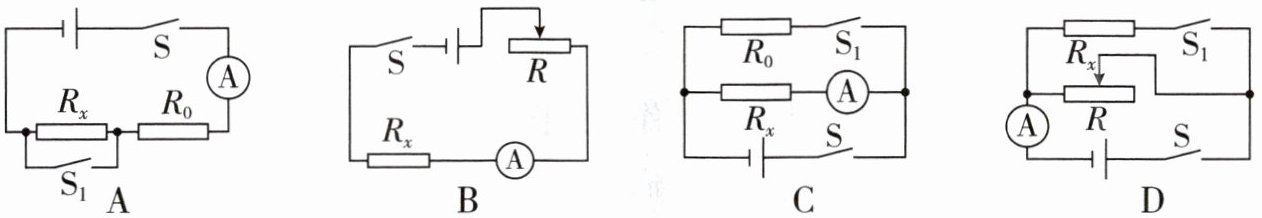 8. 为测量待测电阻器的电阻$R_{x}$,小明设计了以下四个电路,其中电源电压未知且不变,定值电阻的电阻$R_{0}$和滑动变阻器的最大电阻$R$均已知,则不能达到实验目的的是 ()